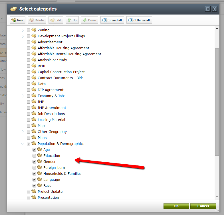 You can click on the arrow to the left of any of these and see the sub-categories below each. You may click the box to the left of as many of the categories as you like to select them. Note that clicking a box on a category inside a folder will automatically also select the parent category box, but you may also select the parent category alone.